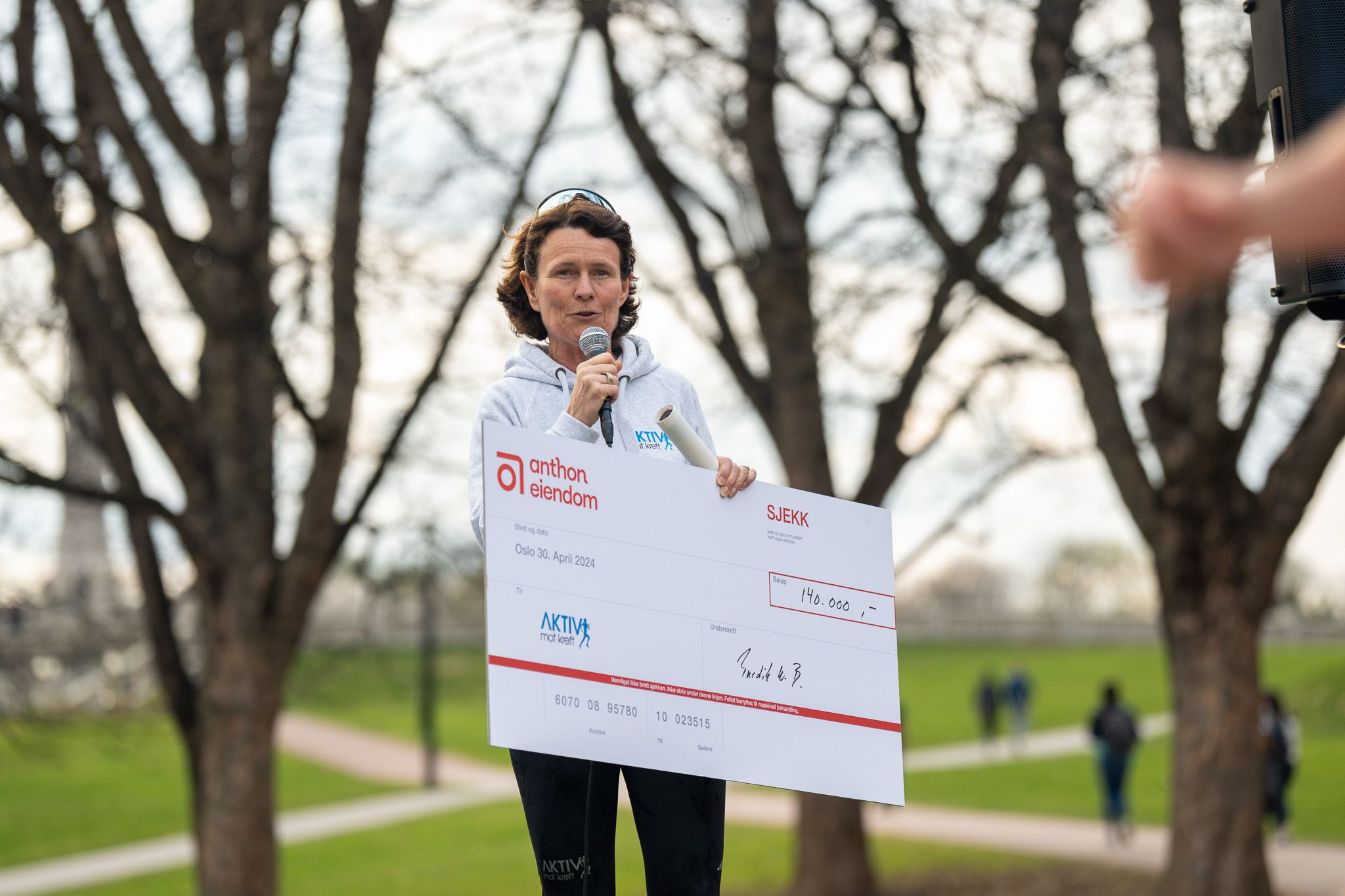 Etter premieutdelingen i Frognerparken kunne utviklingsdirektør Fredrik Baumann fra Anthon Eiendom også i år overrekke en symbolsk sjekk på kr 140 000 til Helle Aanesen fra Aktiv mot kreft.