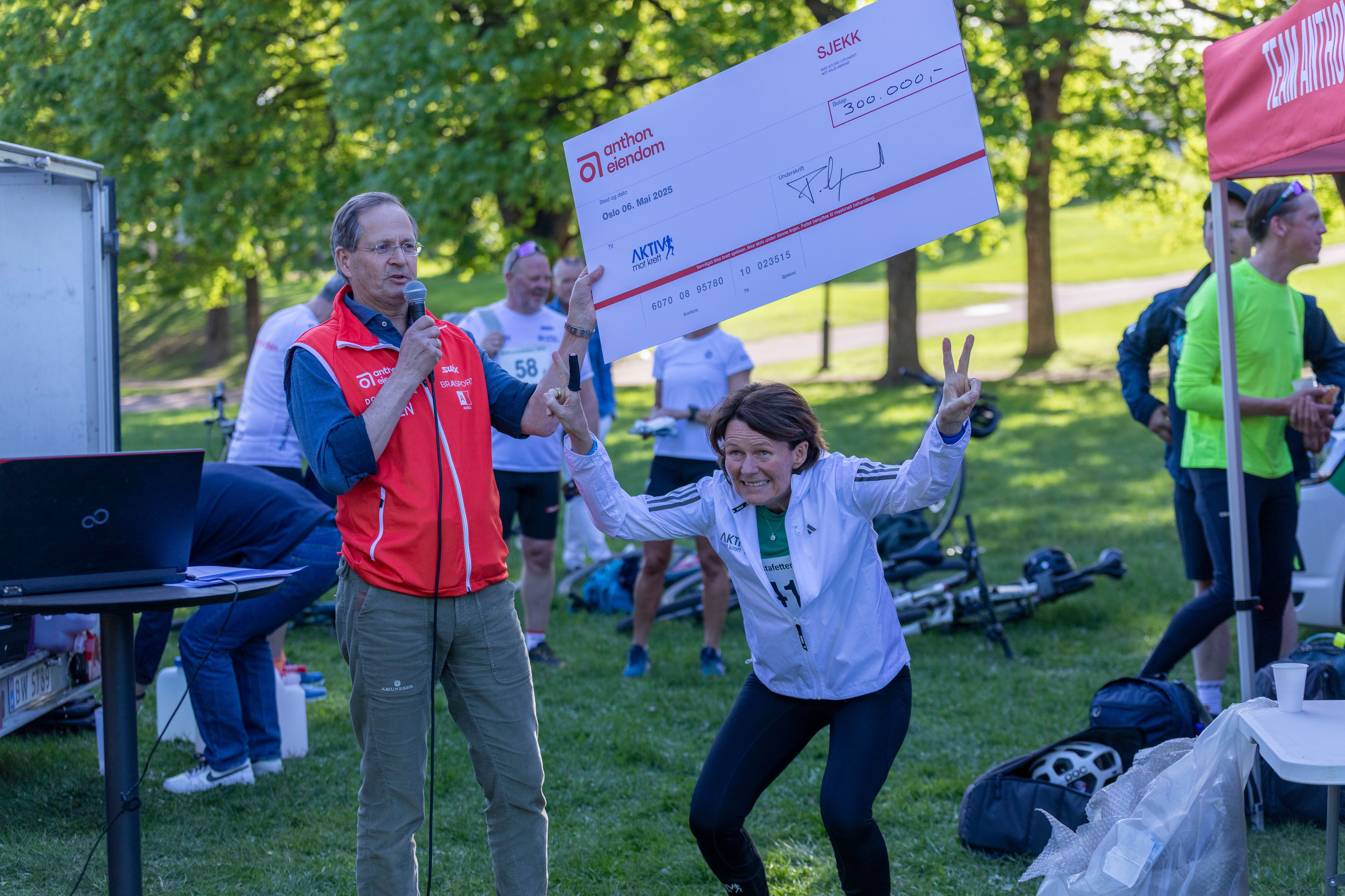 Etter at stafetten var overstått, kunne adm. direktør Peder Chr. Løvenskiold jublende overrekke Aktiv mot kreft en rekordsjekk på kr 300 000.