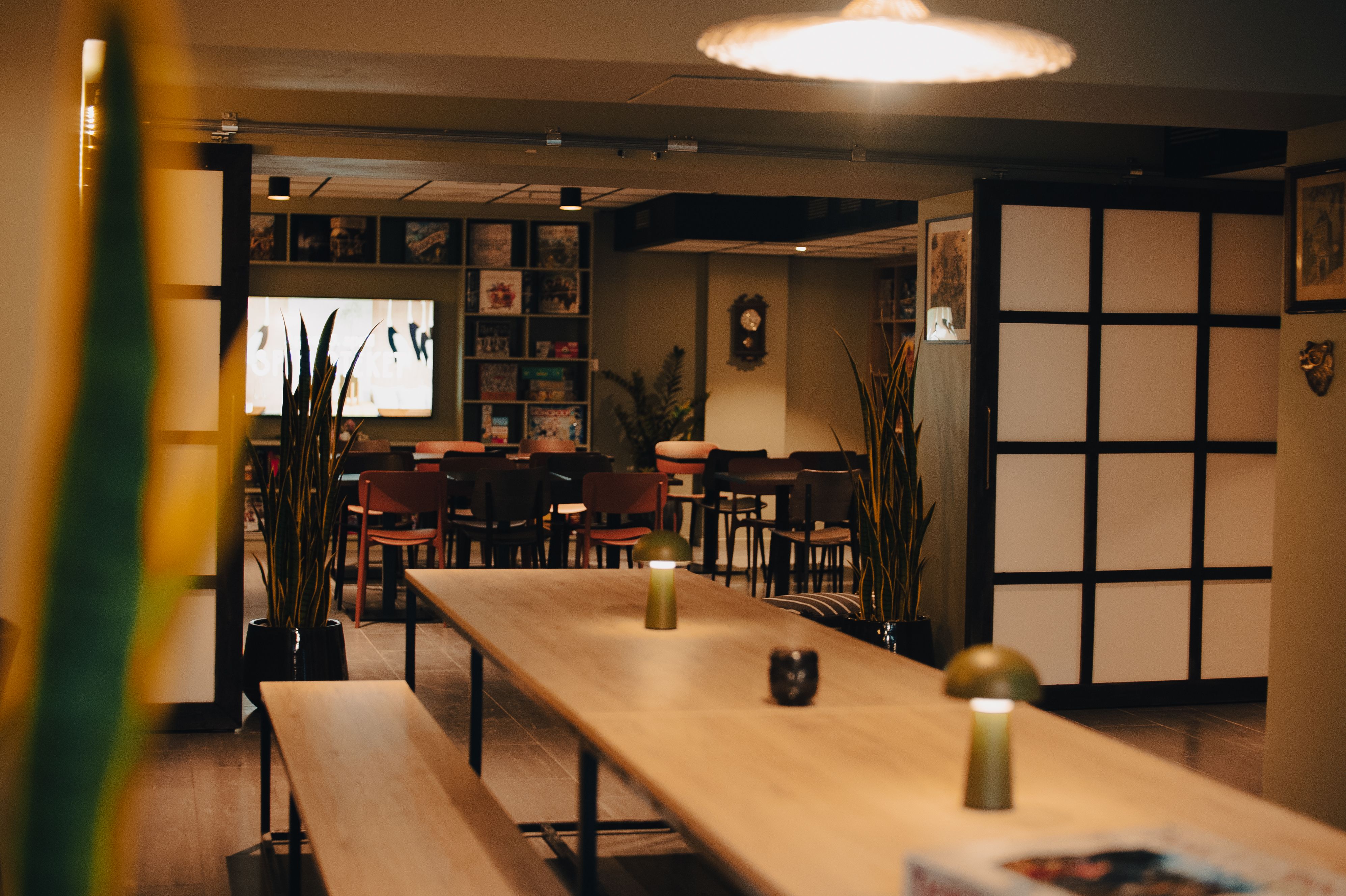 Byhotell og brettspillbar, vegg i vegg